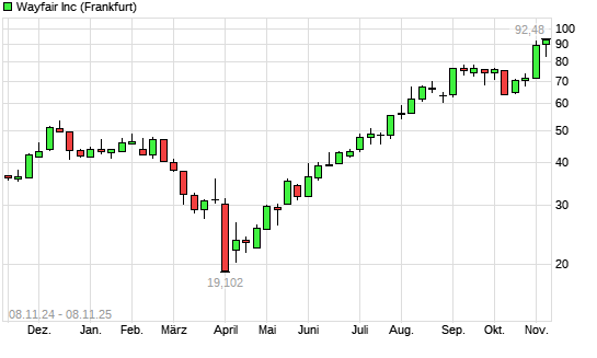 Mit dem Anstieg auf 92,48 EUR hat die Wayfair A-Aktie (ISIN US94419L1017) am 07.11.2025 ein neues 3-Jahres-Hoch erreicht und damit den Kurs vom 28.10.2025 eingestellt.Die Wayfair A-Aktie befindet ...weiterlesen