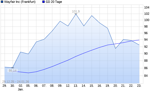 Mit dem Rücksetzer auf 92,50 EUR hat die Wayfair A-Aktie am 23.01.2026 die 20-Tage-Linie nach unten gekreuzt.Die Wayfair A-Aktie befindet sich seit dem 05.06.2025 im langfristigen Aufwärtstrend ...weiterlesen