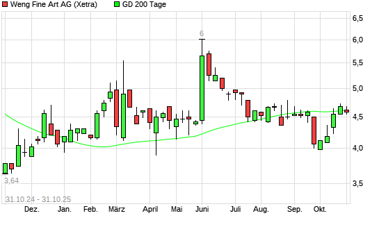 Mit dem Rücksetzer auf 4,46 EUR hat die Weng Fine Art-Aktie am 30.10.2025 die 200-Tage-Linie nach unten gekreuzt.Die Weng Fine Art-Aktie befand sich seit dem 21.10.2025 im langfristigen ...weiterlesen