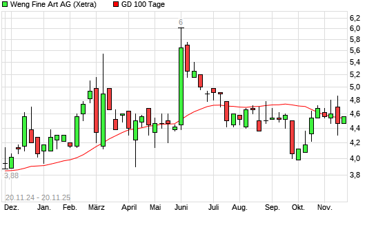Mit dem Anstieg auf 4,48 EUR hat die Weng Fine Art-Aktie am 19.11.2025 die 100-Tage-Linie nach oben gekreuzt.Die Weng Fine Art-Aktie befindet sich seit dem 17.11.2025 im langfristigen Abwärtstrend ...weiterlesen