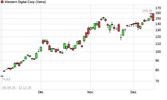 Mit dem Anstieg auf 158,62 EUR hat die Western Digital-Aktie (ISIN US9581021055) am 11.12.2025 ein neues All-Time-High erreicht und damit den Kurs vom 10.12.2025 eingestellt.Die Western Digital-Aktie ...weiterlesen
