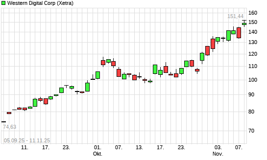 Mit dem Anstieg auf 150,76 EUR hat die Western Digital-Aktie (ISIN US9581021055) am 10.11.2025 ein neues All-Time-High erreicht und damit den Kurs vom 06.11.2025 eingestellt.Die Western Digital-Aktie ...weiterlesen