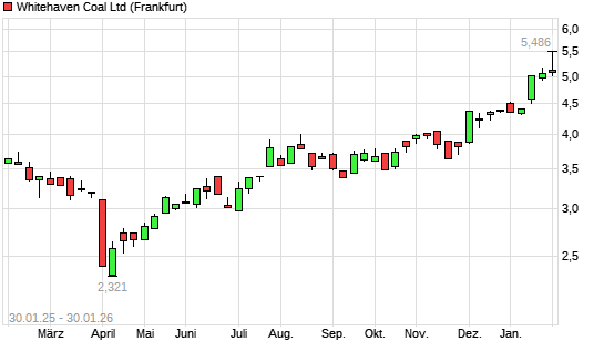 Mit dem Anstieg auf 5,41 EUR hat die Whitehaven Coal-Aktie (ISIN AU000000WHC8) am 29.01.2026 ein neues 12-Monats-Hoch erreicht und damit den Kurs vom 28.01.2026 eingestellt.Die Whitehaven Coal-Aktie ...weiterlesen