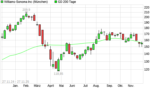 Mit dem Anstieg auf 155,15 EUR hat die Williams-Sonoma-Aktie am 26.11.2025 die 200-Tage-Linie nach oben gekreuzt.Die Williams-Sonoma-Aktie befand sich seit dem 18.11.2025 im langfristigen Aufwärtstrend ...weiterlesen