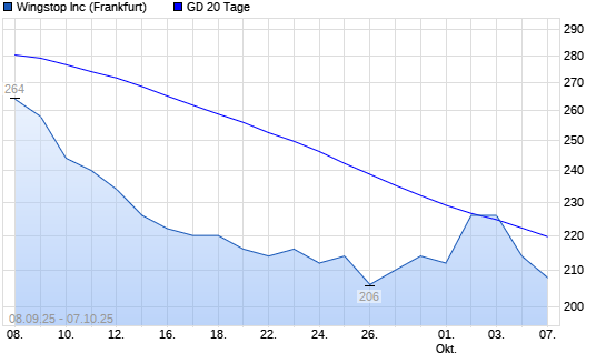Mit dem Rücksetzer auf 214,00 EUR hat die Wingstop-Aktie am 06.10.2025 die 20-Tage-Linie nach unten gekreuzt.Die Wingstop-Aktie befindet sich seit dem 05.09.2025 im langfristigen Abwärtstrend ...weiterlesen