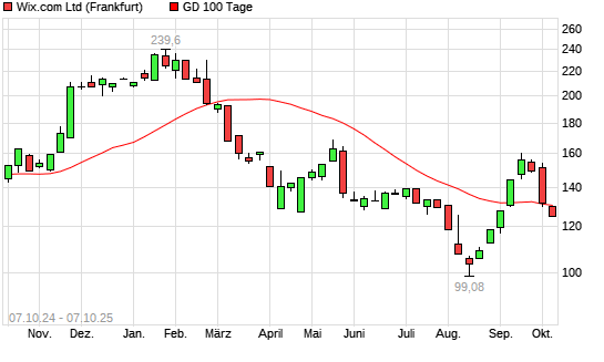 Mit dem Rücksetzer auf 129,60 EUR hat die Wix.com-Aktie am 06.10.2025 die 100-Tage-Linie nach unten gekreuzt.Die Wix.com-Aktie befindet sich seit dem 07.03.2025 im langfristigen Abwärtstrend ...weiterlesen