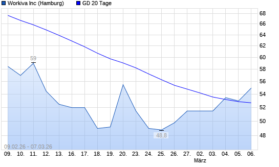 Mit dem Anstieg auf 55,00 EUR hat die Workiva-Aktie am 06.03.2026 die 20-Tage-Linie nach oben gekreuzt.Die Workiva-Aktie befindet sich seit dem 30.01.2026 im langfristigen Abwärtstrend ...weiterlesen