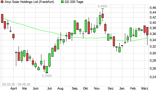 Mit dem Anstieg auf 0,35 EUR hat die XINYI SOLAR Holding-Aktie am 04.03.2026 die 200-Tage-Linie nach oben gekreuzt.Die XINYI SOLAR Holding-Aktie befand sich seit dem 03.03.2026 ...weiterlesen