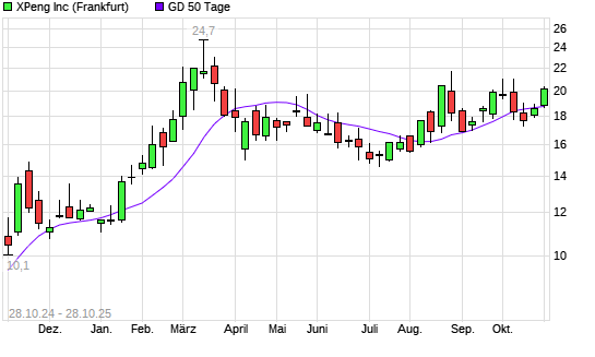 Mit dem Anstieg auf 20,40 EUR hat die XPeng-Aktie am 27.10.2025 die 50-Tage-Linie nach oben gekreuzt.Die XPeng-Aktie befindet sich seit dem 04.08.2025 im langfristigen Aufwärtstrend und hat ...weiterlesen