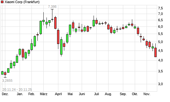 Mit dem Rücksetzer auf 4,27 EUR hat die Xiaomi-Aktie (ISIN KYG9830T1067) am 19.11.2025 ein neues 6-Monats-Tief erreicht und damit den Kurs vom 17.11.2025 eingestellt.Die Xiaomi-Aktie befindet ...weiterlesen