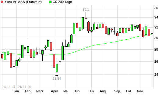 Mit dem Anstieg auf 30,77 EUR hat die Yara International-Aktie am 25.11.2025 die 200-Tage-Linie nach oben gekreuzt.Die Yara International-Aktie befand sich seit dem 21.11.2025 im langfristigen ...weiterlesen