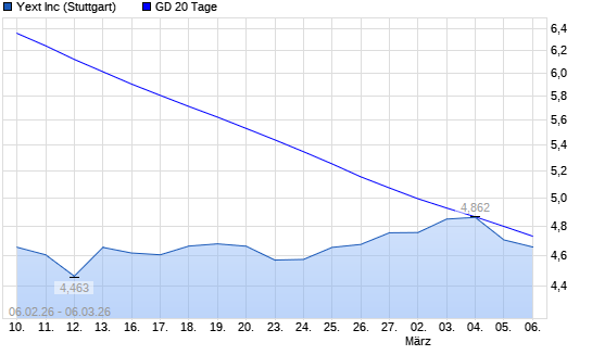 Mit dem Rücksetzer auf 4,66 EUR hat die Yext-Aktie am 05.03.2026 die 20-Tage-Linie nach unten gekreuzt.Die Yext-Aktie befindet sich seit dem 12.01.2026 im langfristigen ...weiterlesen