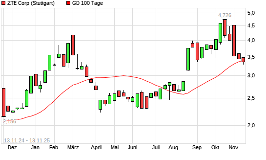 Mit dem Rücksetzer auf 3,35 EUR hat die ZTE-Aktie am 12.11.2025 die 100-Tage-Linie nach unten gekreuzt.Die ZTE-Aktie befindet sich seit dem 13.08.2025 im langfristigen Aufwärtstrend und ...weiterlesen