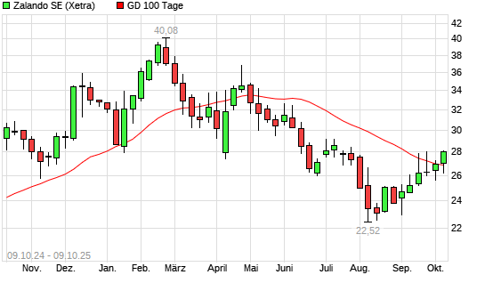 Mit dem Anstieg auf 27,68 EUR hat die Zalando-Aktie am 08.10.2025 die 100-Tage-Linie nach oben gekreuzt.Die Zalando-Aktie befindet sich seit dem 04.06.2025 im langfristigen Abwärtstrend und ...weiterlesen