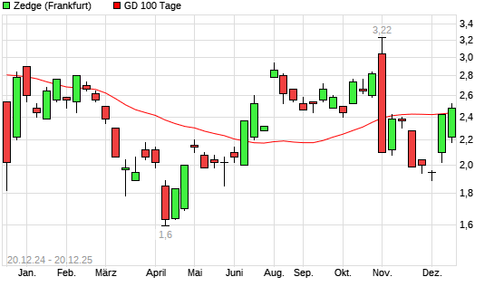 Mit dem Anstieg auf 2,48 EUR hat die Zedge-Aktie am 19.12.2025 die 100-Tage-Linie nach oben gekreuzt.Die Zedge-Aktie befindet sich seit dem 18.12.2025 im langfristigen Aufwärtstrend und hat ...weiterlesen