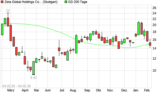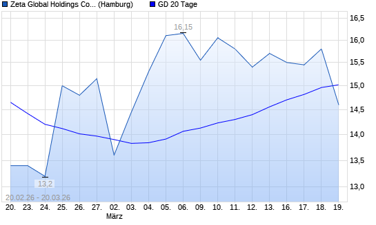 Mit dem Rücksetzer auf 14,85 EUR hat die Zeta Global Holdings Aktie-Aktie am 19.03.2026 die 20-Tage-Linie nach unten gekreuzt.Die Zeta Global Holdings Aktie-Aktie befindet sich ...weiterlesen