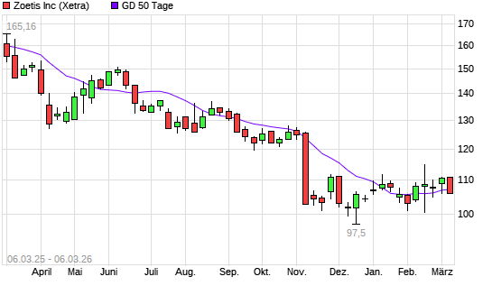 Mit dem Rücksetzer auf 106,00 EUR hat die Zoetis-Aktie am 05.03.2026 die 50-Tage-Linie nach unten gekreuzt.Die Zoetis-Aktie befindet sich seit dem 13.02.2025 im ...weiterlesen