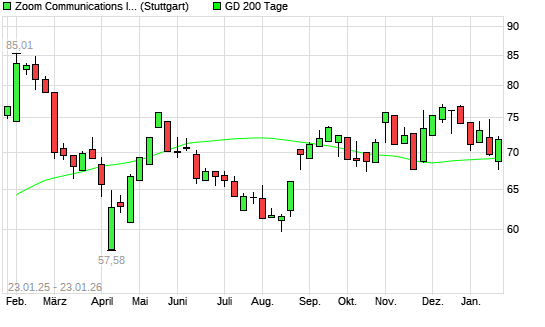 Mit dem Anstieg auf 80,35 EUR hat die Zoom Video Communications-Aktie (ISIN US98980L1017) am 29.01.2026 ein neues 6-Monats-Hoch erreicht und damit den Kurs vom 26.01.2026 eingestellt.Die Zoom ...weiterlesen