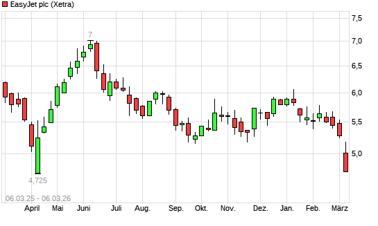 Mit dem Rücksetzer auf 4,81 EUR hat die easyJet Airline-Aktie (ISIN GB00B7KR2P84) am 05.03.2026 ein neues 12-Monats-Tief erreicht und damit den Kurs vom 07.04.2025 ...weiterlesen