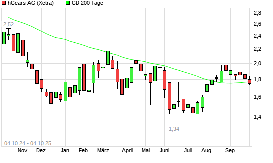 Mit dem Rücksetzer auf 1,34 EUR hat die hGears-Aktie am 03.10.2025 die 200-Tage-Linie nach unten gekreuzt.Die hGears-Aktie befand sich seit dem 02.10.2025 im langfristigen Aufwärtstrend ...weiterlesen