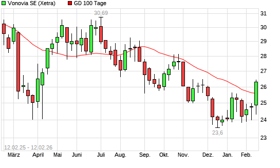 Mit dem Anstieg auf 25,86 EUR hat die Vonovia-Aktie am 11.02.2026 die 100-Tage-Linie nach oben gekreuzt.Die Vonovia-Aktie befindet sich seit dem 17.10.2025 im langfristigen Abwärtstrend und ...weiterlesen