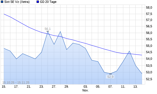 Mit dem Rücksetzer auf 52,50 EUR hat die Sixt Vz-Aktie am 14.11.2025 die 20-Tage-Linie nach unten gekreuzt.Die Sixt Vz-Aktie befindet sich seit dem 24.09.2025 im langfristigen Abwärtstrend ...weiterlesen