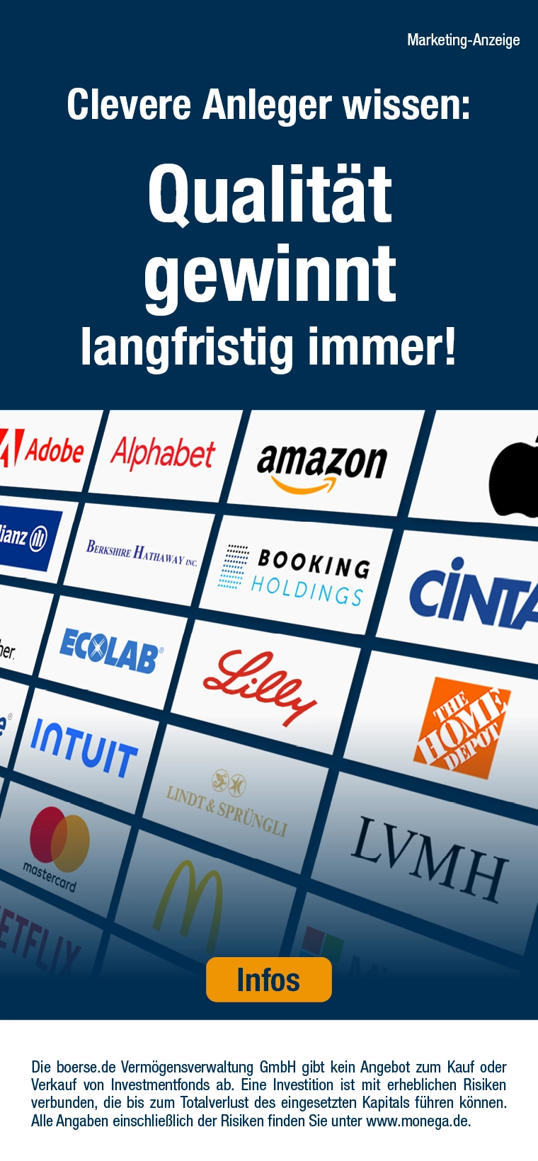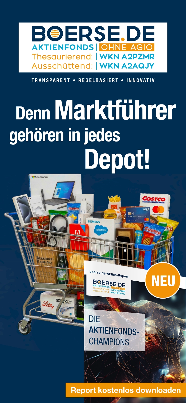 Der boerse.de-Aktienfonds investiert transparent, regelbasiert und innovativ mit gleicher Gewichtung in 40 Top-Champions nach dem Motto "Denn Marktführer gehören in jedes Depot!" Info ...