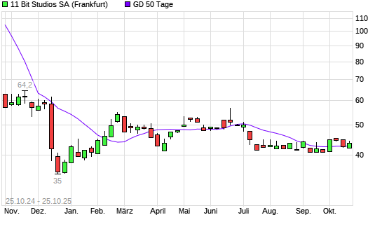 Mit dem Rücksetzer auf 41,92 EUR hat die 11 BIT STUDIOS SA-Aktie am 24.10.2025 die 50-Tage-Linie nach unten gekreuzt.Die 11 BIT STUDIOS SA-Aktie befindet sich seit dem 19.09.2024 im langfristigen ...weiterlesen