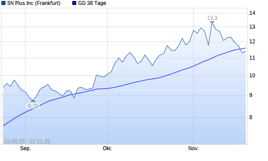 Mit dem Rücksetzer auf 11,16 EUR hat die 5N Plus-Aktie am 21.11.2025 die 38-Tage-Linie nach unten gekreuzt.Der Abstand zur 200-Tage-Linie beträgt aktuell +57,02%. ##trendBox## Die ...weiterlesen