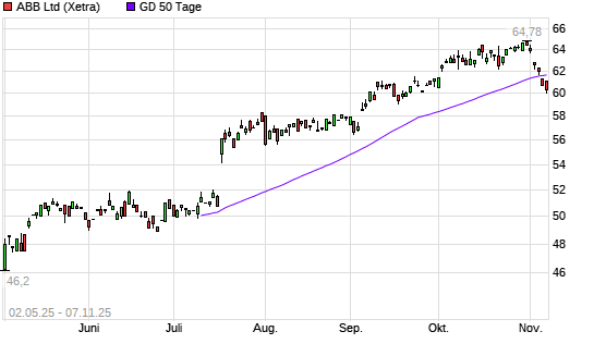 Mit dem Rücksetzer auf 60,52 EUR hat die ABB-Aktie am 06.11.2025 die 50-Tage-Linie nach unten gekreuzt.Die ABB-Aktie befindet sich seit dem 17.07.2025 im langfristigen Aufwärtstrend und ...weiterlesen