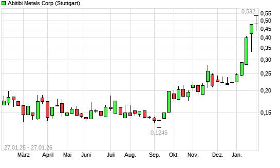 Mit dem Anstieg auf 0,55 EUR hat die ABITIBI METALS-Aktie (ISIN CA00367M1086) am 26.01.2026 ein neues All-Time-High erreicht und damit den Kurs vom 23.01.2026 eingestellt.Die ABITIBI METALS-Aktie ...weiterlesen