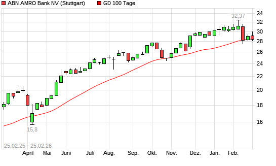 Mit dem Rücksetzer auf 28,30 EUR hat die ABN Amro Group-Aktie am 24.02.2026 die 100-Tage-Linie nach unten gekreuzt.Die ABN Amro Group-Aktie befindet sich seit dem 13.01.2025 ...weiterlesen