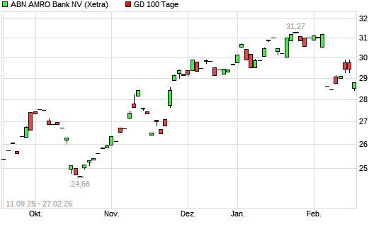 Mit dem Anstieg auf 28,83 EUR hat die ABN Amro Group-Aktie am 26.02.2026 die 100-Tage-Linie nach oben gekreuzt.Die ABN Amro Group-Aktie befindet sich seit dem 13.01.2025 im ...weiterlesen