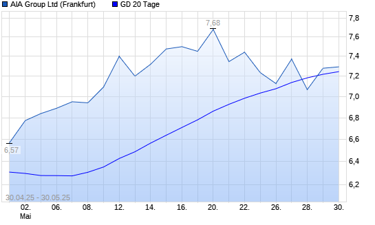 Mit dem Anstieg auf 7,24 EUR hat die AIA Group-Aktie am 29.05.2025 die 20-Tage-Linie nach oben gekreuzt.Die AIA Group-Aktie befindet sich seit dem 06.05.2025 im langfristigen ...weiterlesen