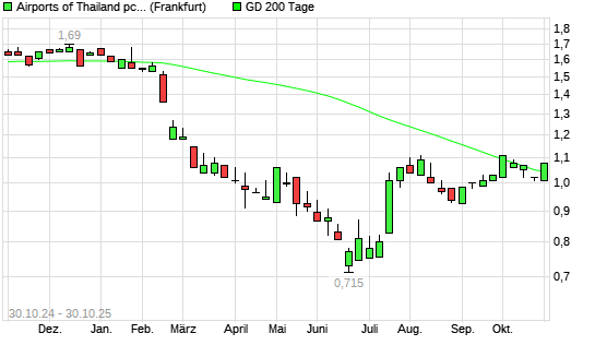 Mit dem Anstieg auf 1,08 EUR hat die AIRPORTS OF THAI UTS-Aktie am 29.10.2025 die 200-Tage-Linie nach oben gekreuzt.Die AIRPORTS OF THAI UTS-Aktie befand sich seit dem 20.10.2025 im langfristigen ...weiterlesen