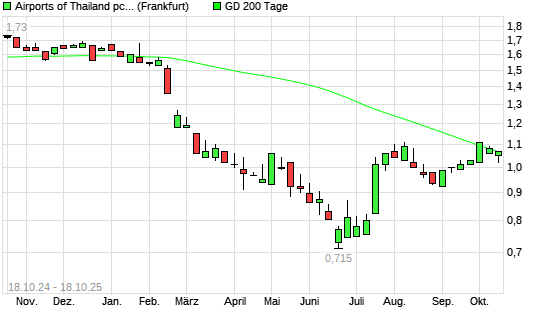 Mit dem Anstieg auf 1,07 EUR hat die AIRPORTS OF THAI UTS-Aktie am 17.10.2025 die 200-Tage-Linie nach oben gekreuzt.Die AIRPORTS OF THAI UTS-Aktie befand sich seit dem 13.10.2025 im langfristigen ...weiterlesen