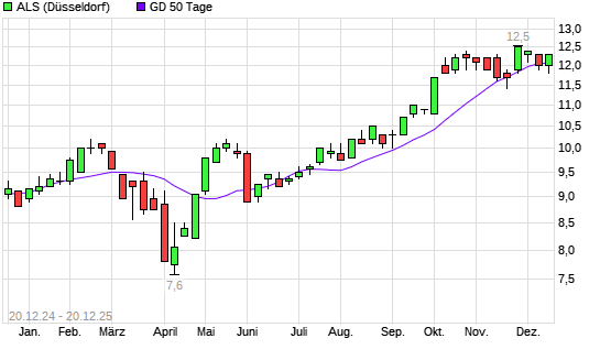 Mit dem Anstieg auf 12,20 EUR hat die ALS-Aktie am 19.12.2025 die 50-Tage-Linie nach oben gekreuzt.Die ALS-Aktie befindet sich seit dem 05.06.2025 im langfristigen Aufwärtstrend und hat in diesem ...weiterlesen