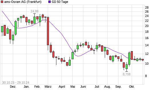 Mit dem Rücksetzer auf 10,63 EUR hat die AMS-Aktie am 28.10.2024 die 50-Tage-Linie nach unten gekreuzt.Der Abstand zur 200-Tage-Linie beträgt aktuell -20,20%. ##trendBox## Die AMS-Aktie ...weiterlesen