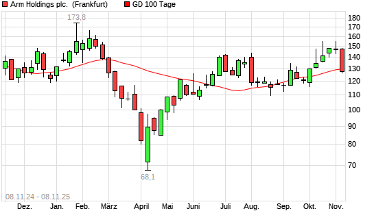 Mit dem Rücksetzer auf 128,00 EUR hat die ARM Holdings-Aktie am 07.11.2025 die 100-Tage-Linie nach unten gekreuzt.Die ARM Holdings-Aktie befindet sich seit dem 02.10.2025 im langfristigen ...weiterlesen