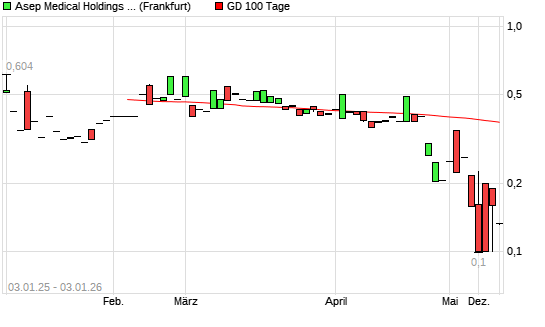 Mit dem Rücksetzer auf 0,13 EUR hat die ASEP MEDICAL HOLDINGS-Aktie am 02.01.2026 die 100-Tage-Linie nach unten gekreuzt.Die ASEP MEDICAL HOLDINGS-Aktie befindet sich seit dem 31.12.2025 ...weiterlesen
