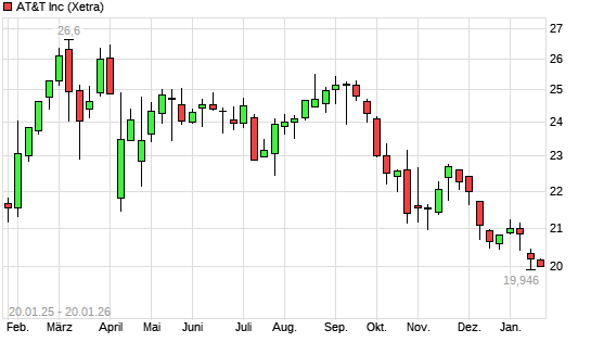 Mit dem Rücksetzer auf 19,89 EUR hat die AT&T-Aktie (ISIN US00206R1023) am 19.01.2026 ein neues 12-Monats-Tief erreicht und damit den Kurs vom 13.01.2026 eingestellt.Die AT&T-Aktie befindet ...weiterlesen