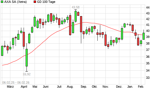 Mit dem Rücksetzer auf 39,42 EUR hat die AXA-Aktie am 05.02.2026 die 100-Tage-Linie nach unten gekreuzt.Die AXA-Aktie befindet sich seit dem 09.01.2026 im langfristigen ...weiterlesen