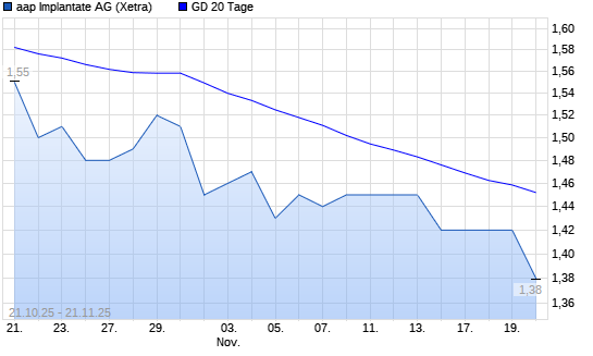 Mit dem Rücksetzer auf 1,41 EUR hat die Aap Implantate-Aktie am 20.11.2025 die 20-Tage-Linie nach unten gekreuzt.Die Aap Implantate-Aktie befindet sich seit dem 08.10.2025 im langfristigen ...weiterlesen