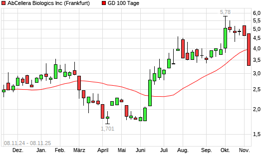 Mit dem Rücksetzer auf 3,30 EUR hat die AbCellera Biologics-Aktie am 07.11.2025 die 100-Tage-Linie nach unten gekreuzt.Die AbCellera Biologics-Aktie befindet sich seit dem 11.06.2025 im ...weiterlesen