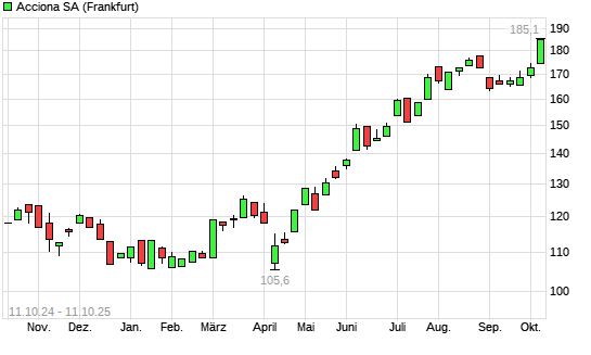 Mit dem Anstieg auf 185,10 EUR hat die Acciona-Aktie (ISIN ES0125220311) am 10.10.2025 ein neues 12-Monats-Hoch erreicht und damit den Kurs vom 07.10.2025 eingestellt.Die Acciona-Aktie befindet ...weiterlesen