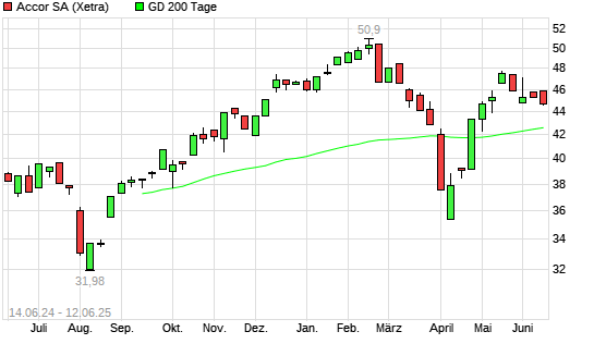 Mit dem Rücksetzer auf 43,91 EUR hat die Accor-Aktie am 13.06.2025 die 200-Tage-Linie nach unten gekreuzt.Die Accor-Aktie befand sich seit dem 28.04.2025 im langfristigen Abwärtstrend und ...weiterlesen