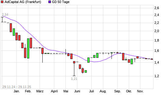 Mit dem Rücksetzer auf 1,45 EUR hat die AdCapital-Aktie am 28.11.2025 die 50-Tage-Linie nach unten gekreuzt.Die AdCapital-Aktie befindet sich seit dem 09.12.2024 im langfristigen Abwärtstrend ...weiterlesen