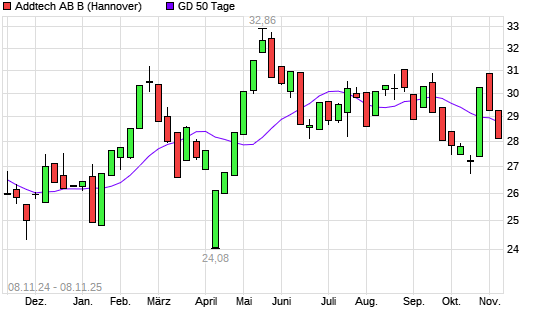 Mit dem Rücksetzer auf 28,06 EUR hat die Addtech AB-Aktie am 07.11.2025 die 50-Tage-Linie nach unten gekreuzt.Die Addtech AB-Aktie befindet sich seit dem 03.11.2025 im langfristigen Abwärtstrend ...weiterlesen