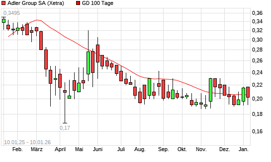 Mit dem Anstieg auf 0,21 EUR hat die Adler-Aktie am 09.01.2026 die 100-Tage-Linie nach oben gekreuzt.Die Adler-Aktie befindet sich seit dem 27.11.2025 im langfristigen Abwärtstrend und hat in ...weiterlesen