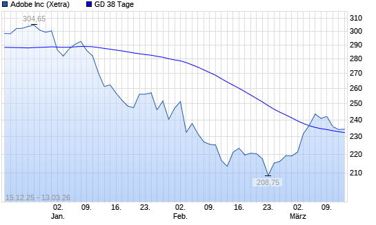 Mit dem Rücksetzer auf 220,75 EUR hat die Adobe-Aktie am 12.03.2026 die 38-Tage-Linie nach unten gekreuzt.Die Adobe-Aktie befindet sich seit dem 12.12.2024 im ...weiterlesen